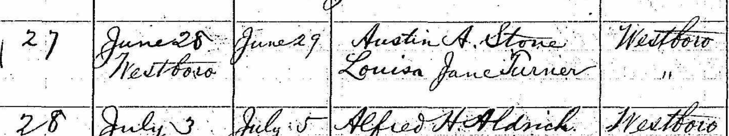 Marriage Record Austin A. Stone & Louisa Jane Turner June 28, 1888, Westboro Massachusetts