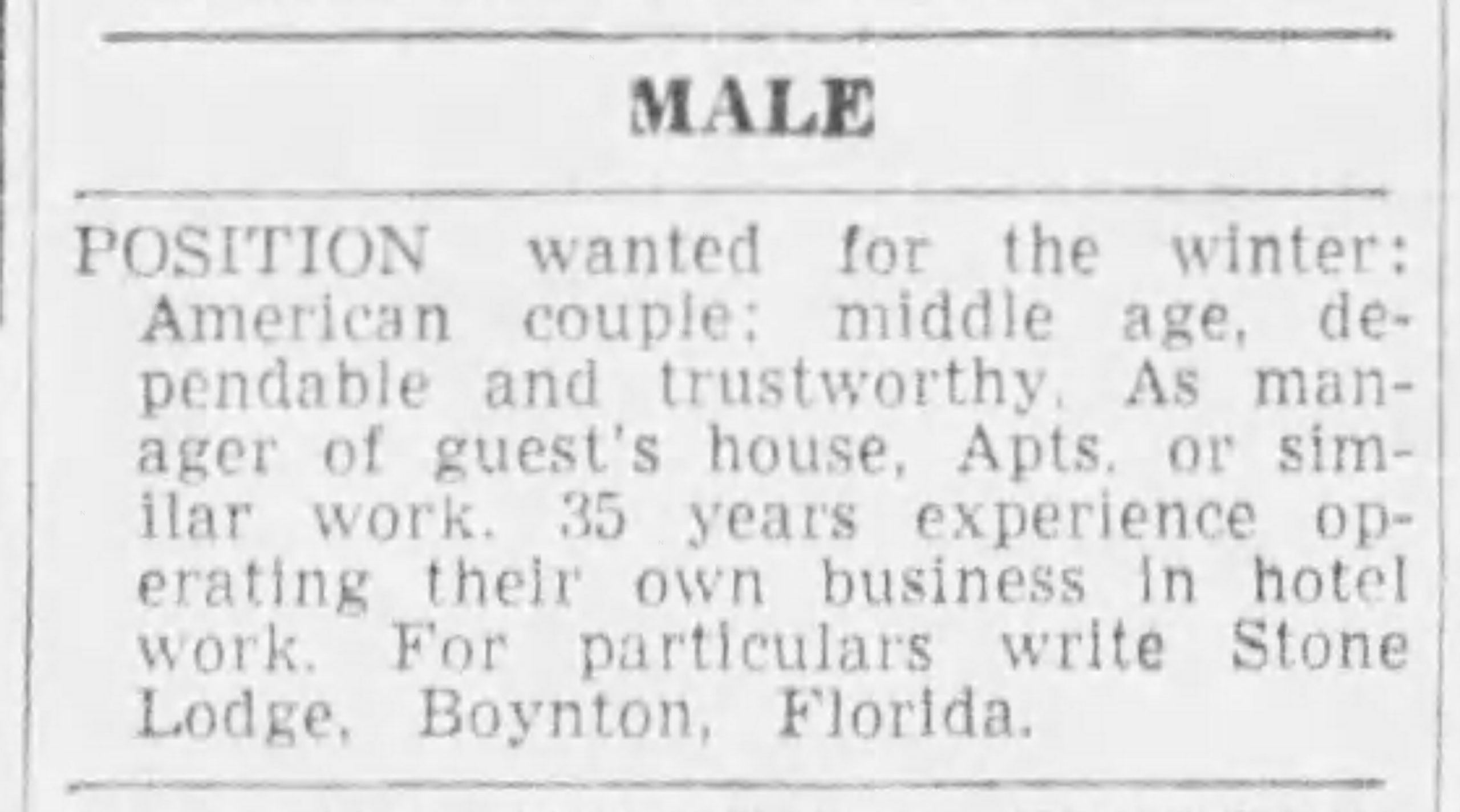 Employment advertisement for manager at Stone Lodge (30 Oct. 1939, The Palm Beach Post).