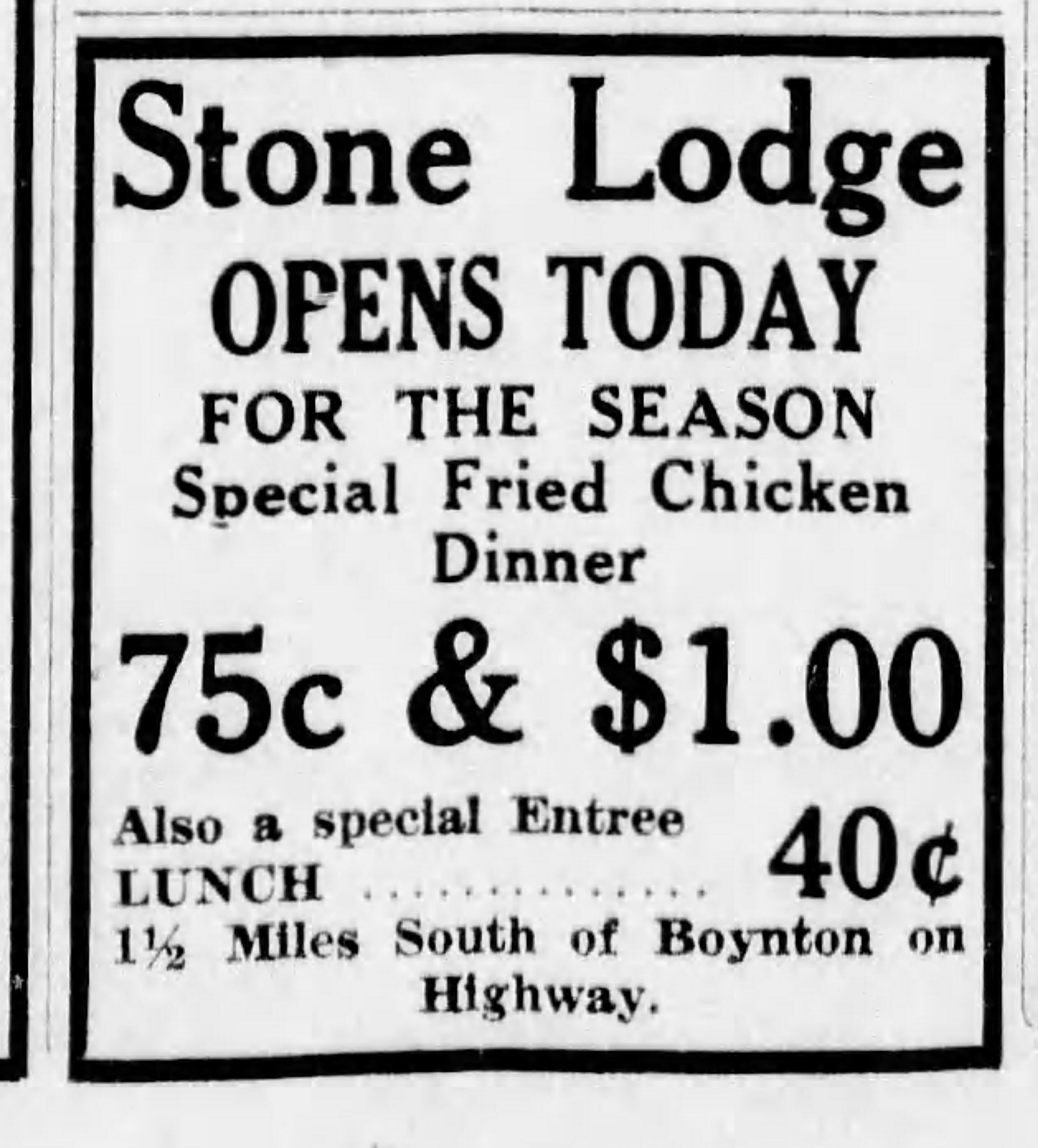 Boynton Stone Lodge opening for season ad (14 Nov. 1931, The Palm Beach Post).