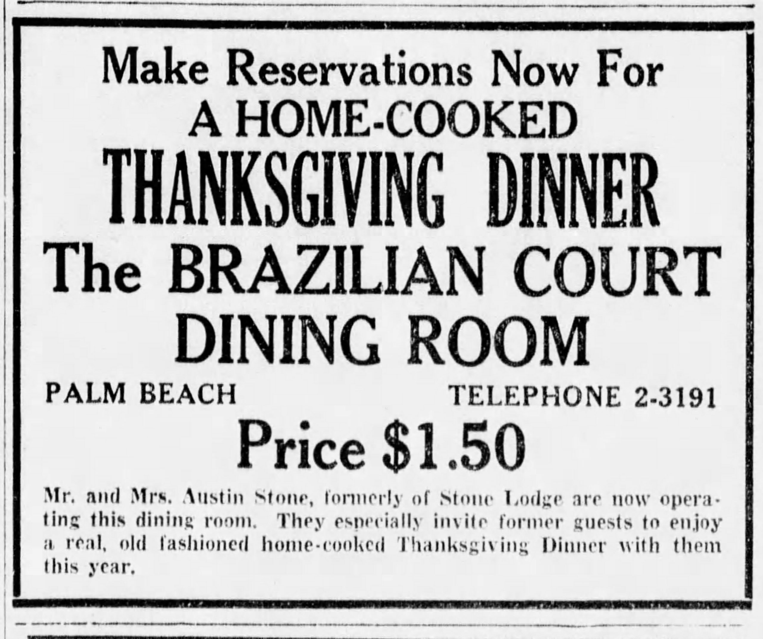 Advertisement for Thanksgiving Dinner at The Brazilian Court Diving Room operated by Mr. & Mrs. Stone (27 Nov. 1928, The Palm Beach Post).